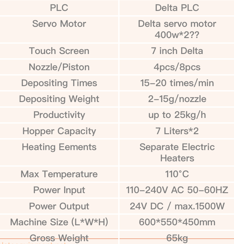 The heated pistons and hopper with up to 110℃ adjustable temperature control to deposit both high and low temperature ingredients.And it allows you to use a wide variety of moulds with it, as the operator can manually position the molds on the dosing nozzles.